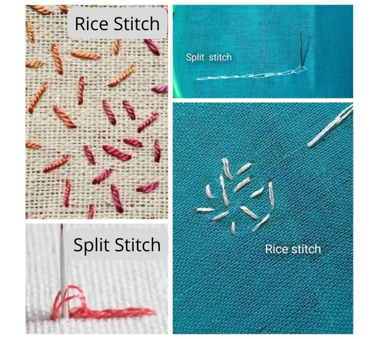 A rice stitch is one of the basic embroidery stitches used to create a textured look on fabric. It consists of tiny stitches that resemble grains of rice. This stitch can be worked in a straight line or a curved line. It can be used to fill in small areas or to outline a design.